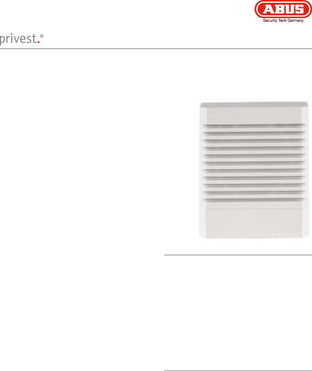ABUS Security-CenterFU9090Privest Wireless Indoor SirenProduct highlights:• Effective alarming of residents in case of events, e.g.fire• Loud Piezo